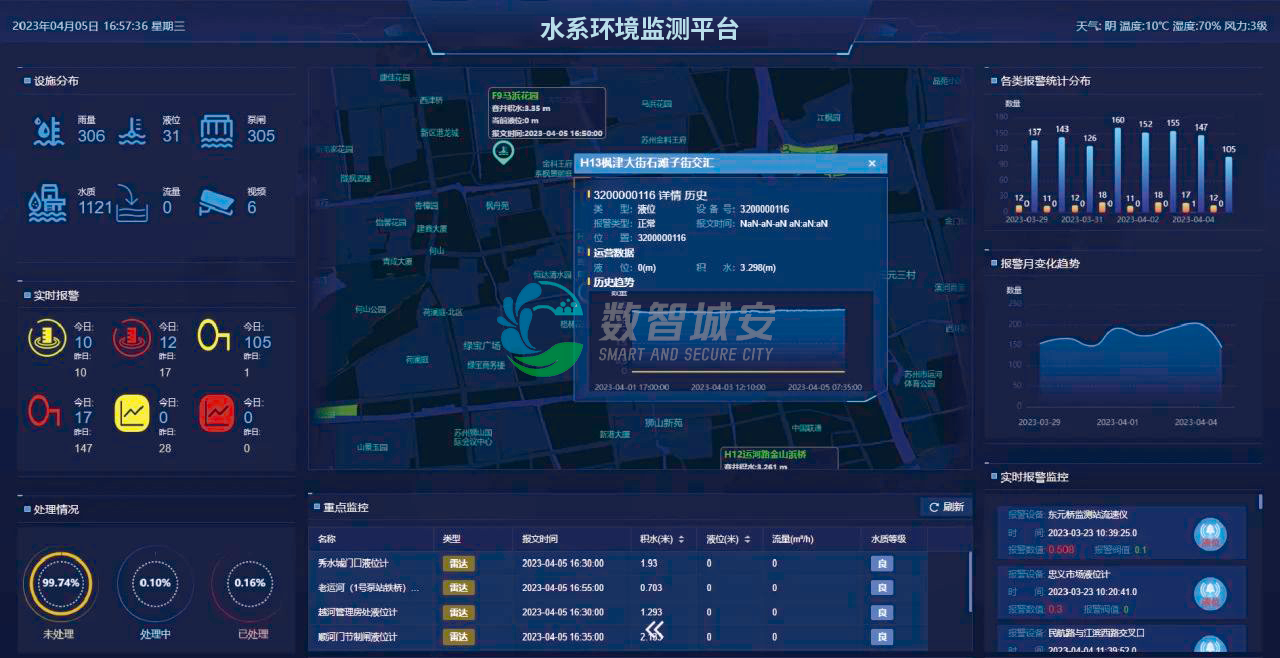 水环境监测平台以实现"四水联治"(治污水、保供水、防涝水、美好水)为目标,通过整合生态环境局、水务局等多个部门数据资源,建成覆盖全流域的多个物联感知自动监测站点网络 ,通过机器学习算法实现污染溯源与预警。建立"监测-预警-处置-反馈"闭环管理系统,对触发告警事件完成销号处理。异常数据通过微信小程序推送属地管理人员,联动生态环境局、水务局等部门开展协同处置 。